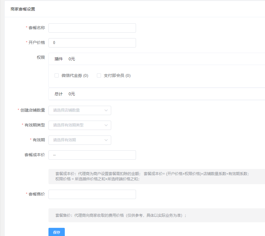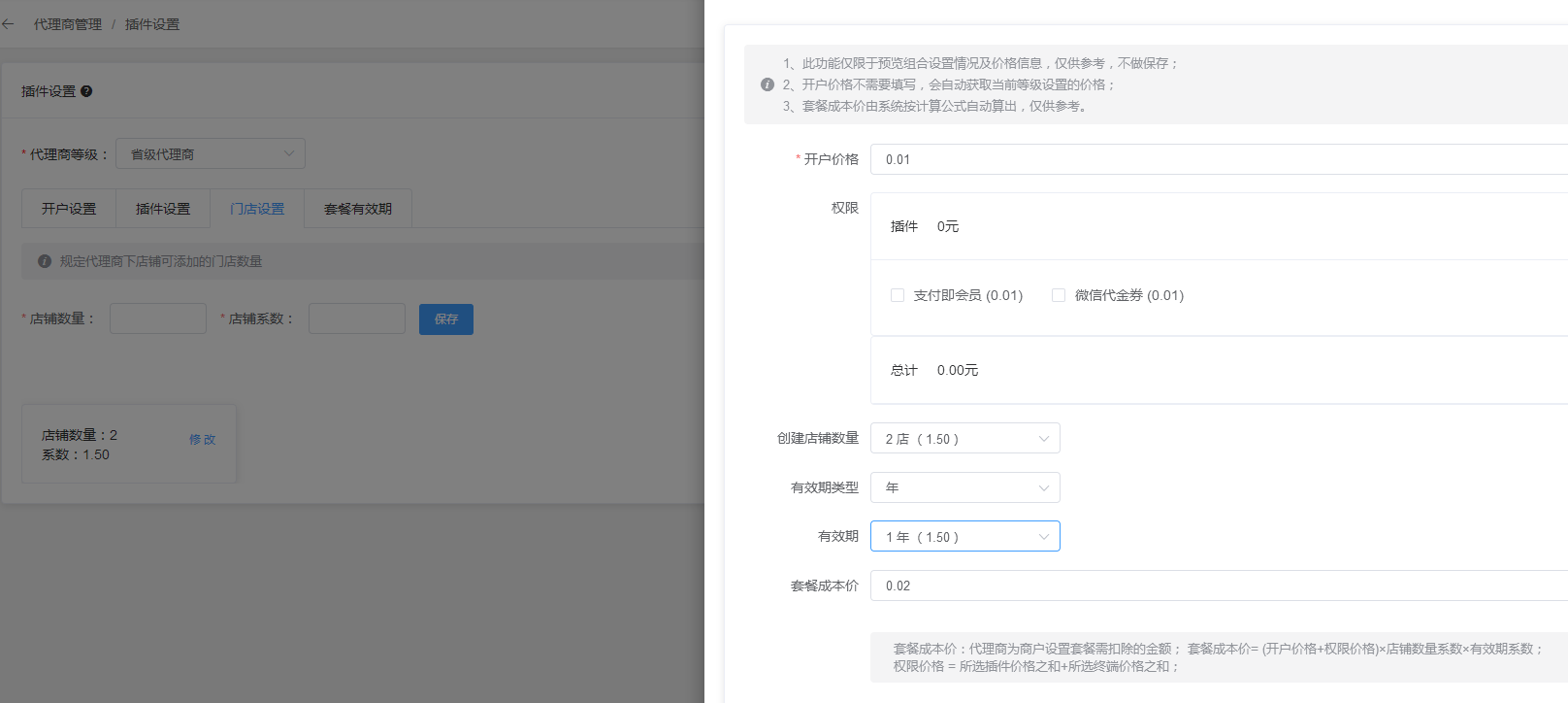 (说明:套餐成本价是 (开户设置+插件)\*店铺系数\*时间系数)