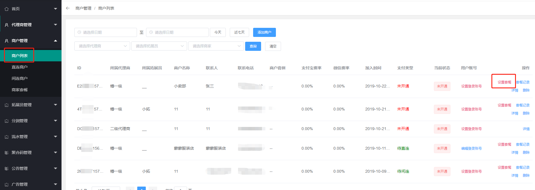 2、给商家设置套餐:点击商户列表--设置套餐\--选择套餐
