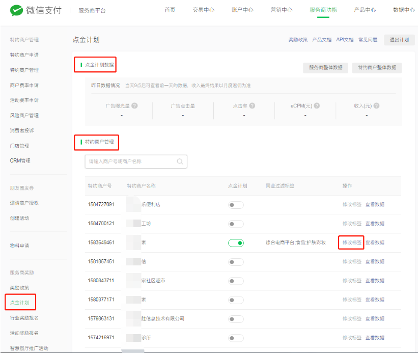 微信服务商平台-点金计划页面-查看点金计划数据,以及特约商户管理列表,查看点金计划状态,可为商户修改同业过滤标签