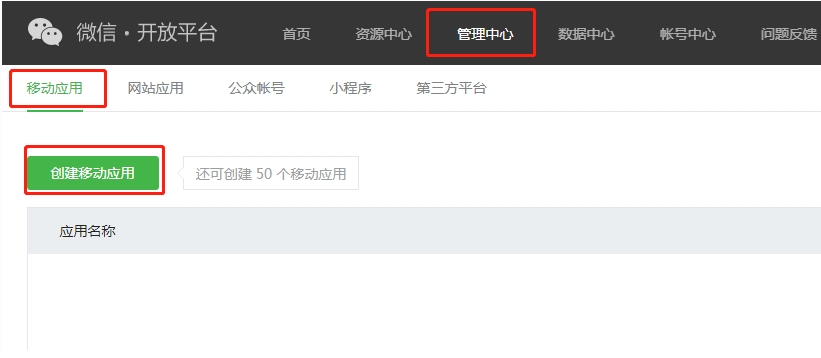 #### (1)登录[微信开放平台](https://open.weixin.qq.com/)→管理中心→移动应用→创建移动应用