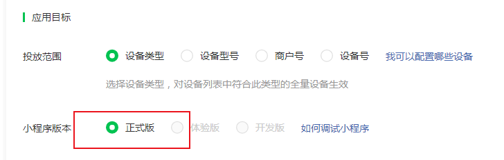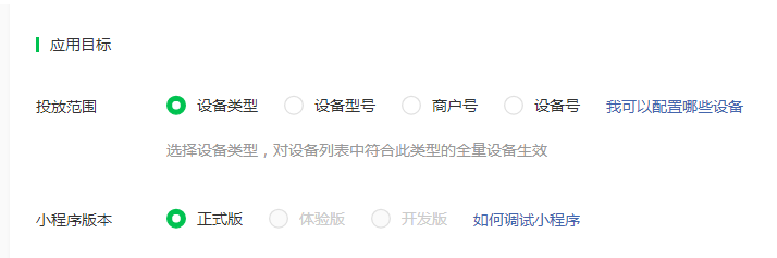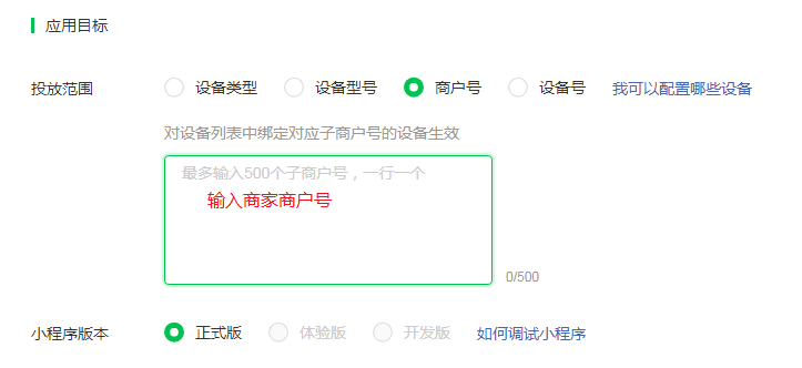 #### 投放范围(四选一,推荐商户号或者设备号)