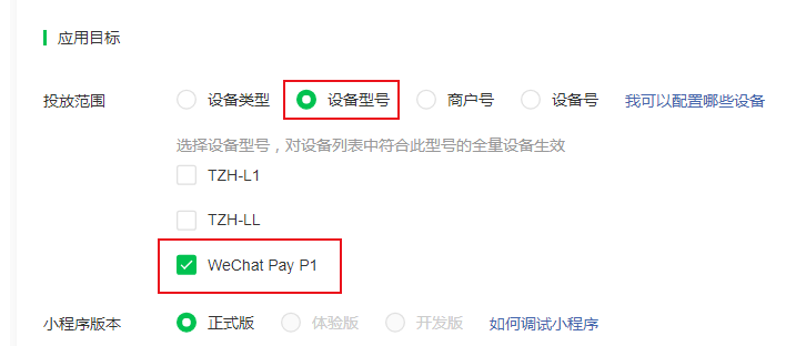 * (2)设备型号:选择设备型号WeChat Pay P1,对设备列表中符合此型号的全量设备生效