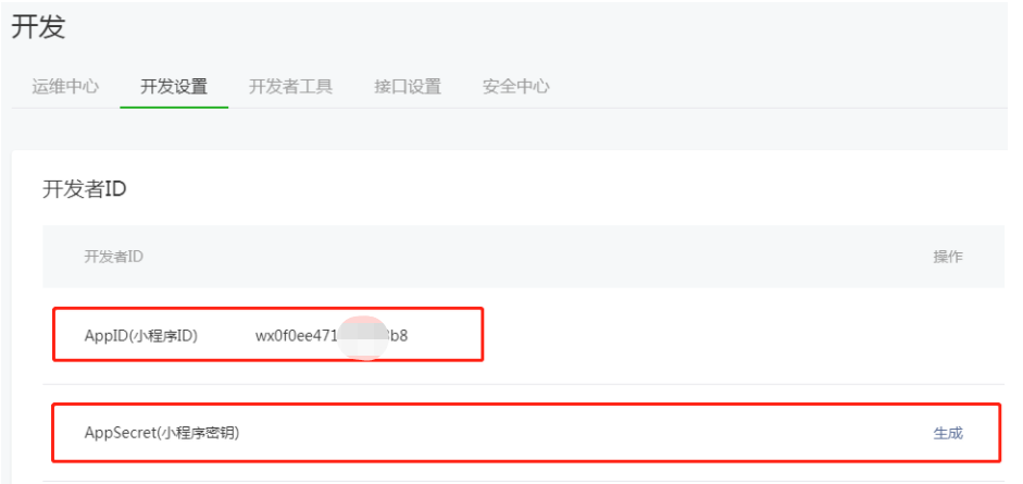 #### (2)开发 → 开发设置 → 记录小程序的APPID(需要填写到合伙人后台) → 生成APPSECRET(记录)。