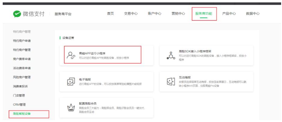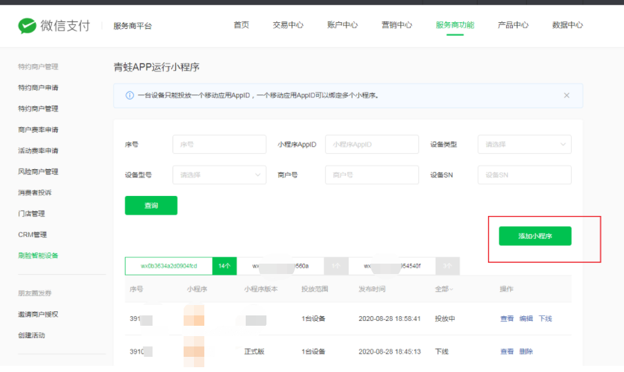 #### 2、服务商功能 → 刷脸智能设备 →[青蛙APP运行小程序](https://pay.weixin.qq.com/index.php/xphp/cfrog_minip/samll_program_setting_index#/)→ 添加小程序