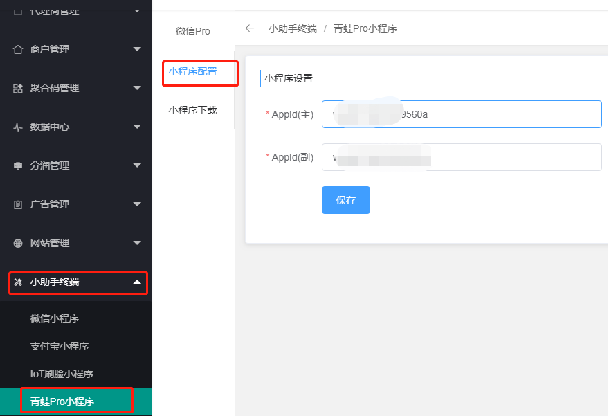#### (1)登录代理后台 → 小助手终端 →青蛙pro小程序 → 小程序配置 → 填写微信小程序的APPID (主、副填写一致)→ 保存。