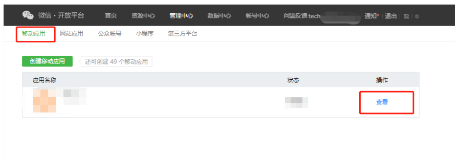 * #### 登录微信开放平台→ 移动应用→ 找到自己的移动应用→ 点击查看:进入管理中心应用详情页面