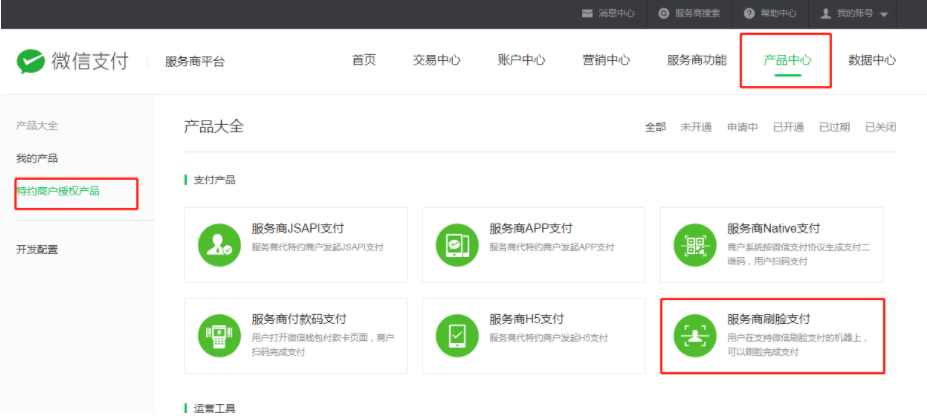 #### 1、登录[微信支付服务商平台](https://pay.weixin.qq.com/partner/public/home),产品中心 → 特约商户授权产品 → 服务商刷脸支付 → 点击开通