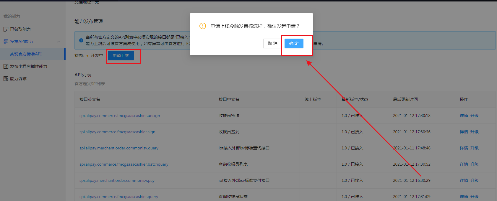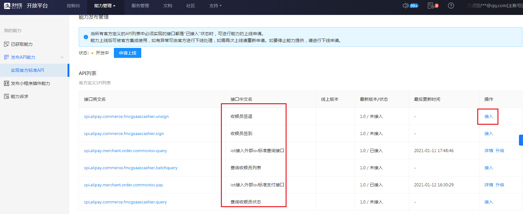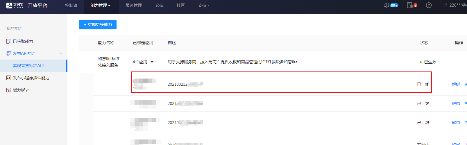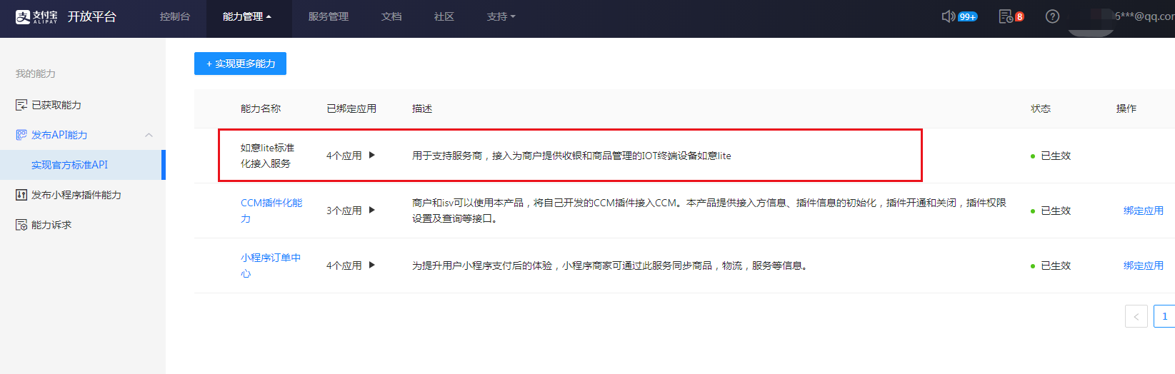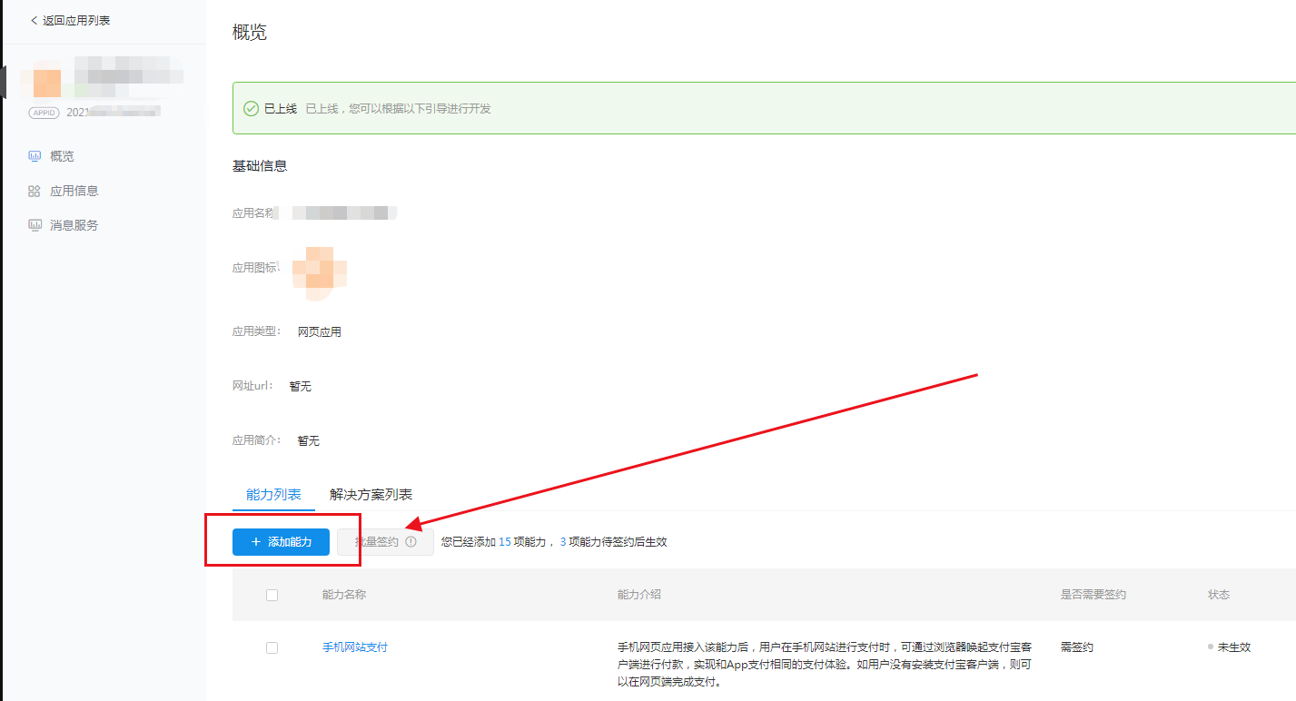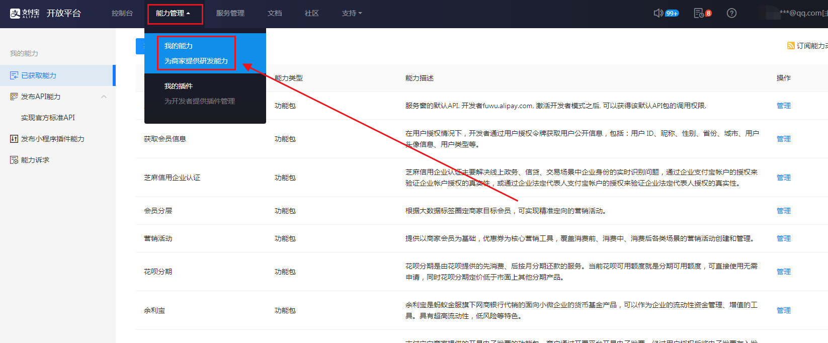 #### 1、登录支付宝开放平台,点击:能力管理 → 我的能力