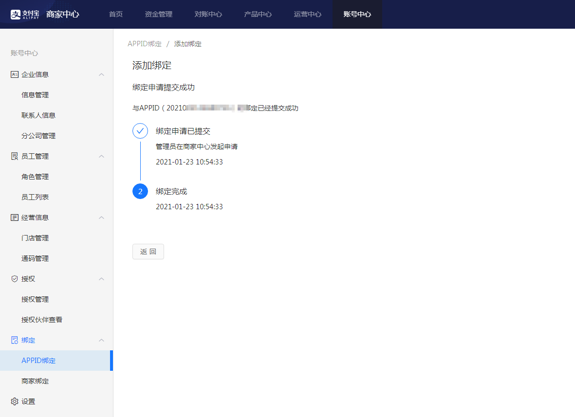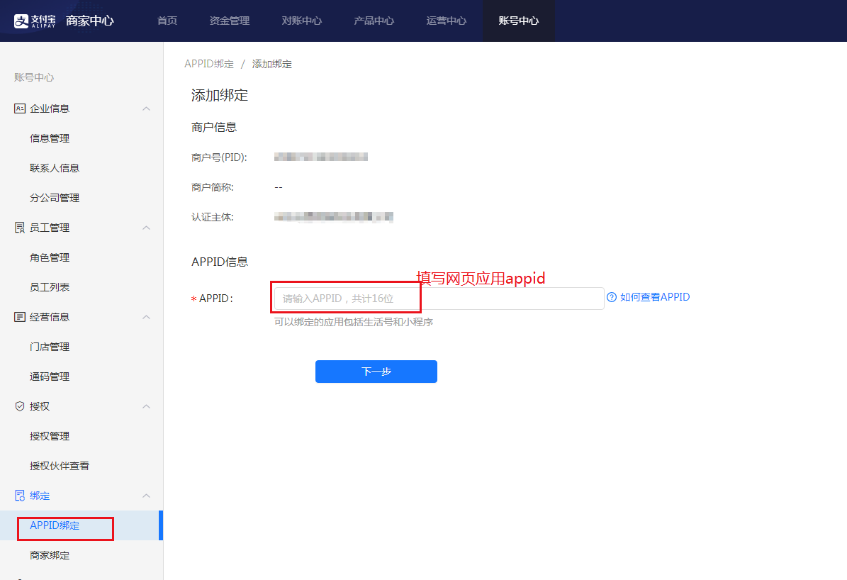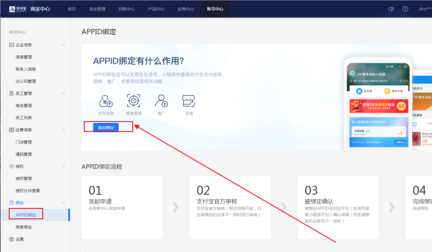 #### 1、前往支付宝开放平台的网页应用,点击[商家中心](https://mrchportalweb.alipay.com/accountmanage/bind/appIdBindList),进行APPID绑定,发起 APPID 绑定。