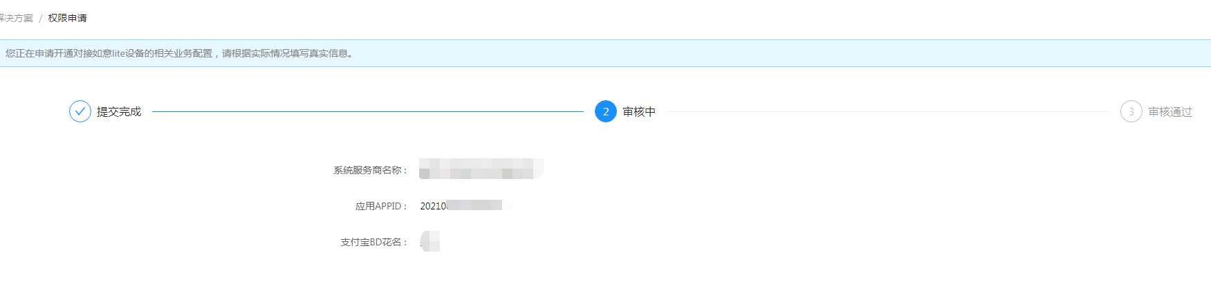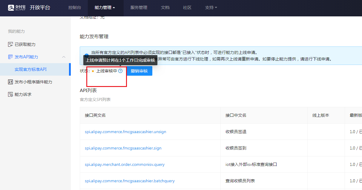 #### 前往[https://open.alipay.com/svr/ability/solution/own](https://open.alipay.com/svr/ability/solution/own)查看审核结果,通过之后再操作下一步