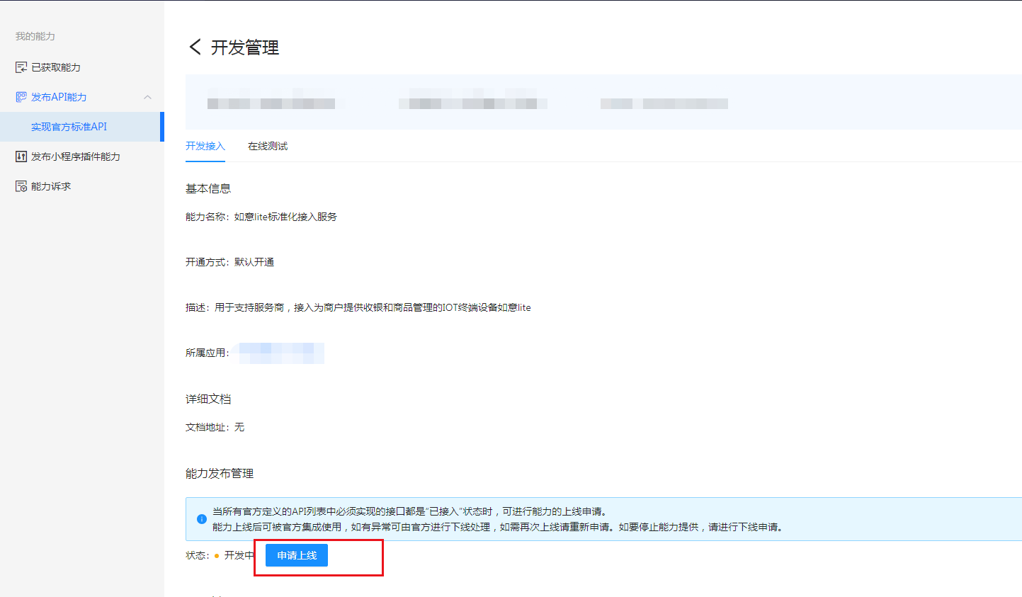 #### 2、点击发布API能力 → 实现官方标准API → 点击: 如意lite标准化接入服务