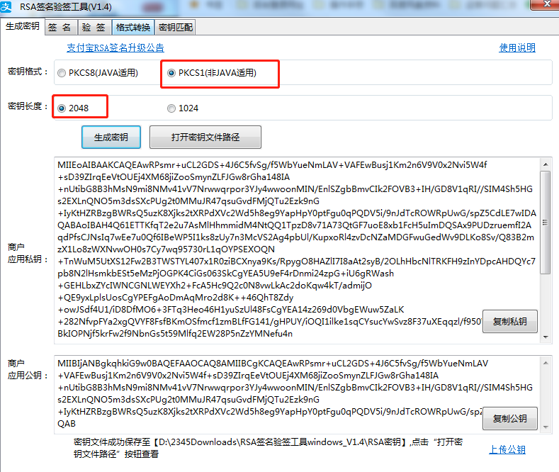 * \[6\]密钥格式选择:PKCS1(非java适用) ;密钥长度:2048 位