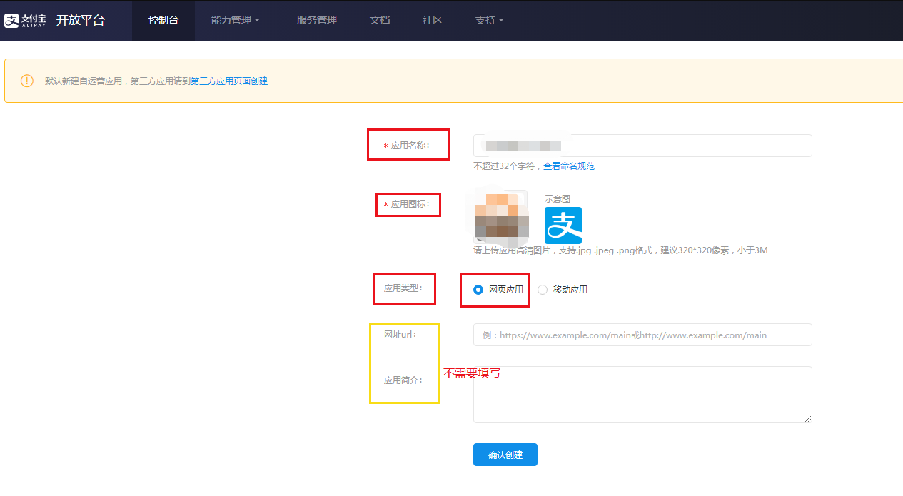 #### 2、填写应用名称、上传图标、选择:网页应用 → 确认创建