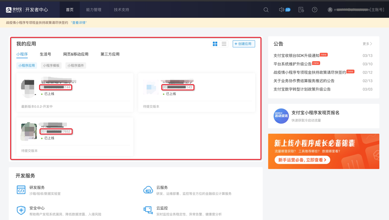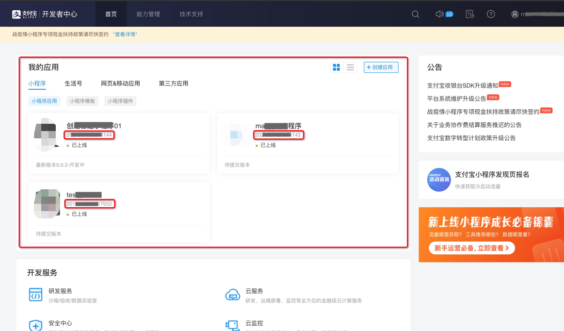 #### \* 如需查询要绑定的 APPID,可访问[支付宝开发者中心](https://developers.alipay.com/),用应用所有者的账号(使用手机支付宝扫码或者邮箱/手机号/淘宝会员名)完成登录后,在开发者中心首页中的**我的应用**板块,可以看到在每个应用下的 APPID(一串数字),如下图: