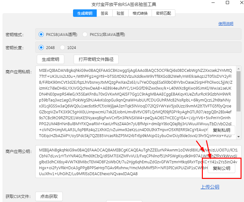 点击:生成密钥 (生成完成后,点击复制下面的“商户应用公钥”)复制好之后,先不要关闭网页