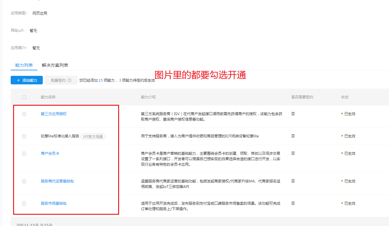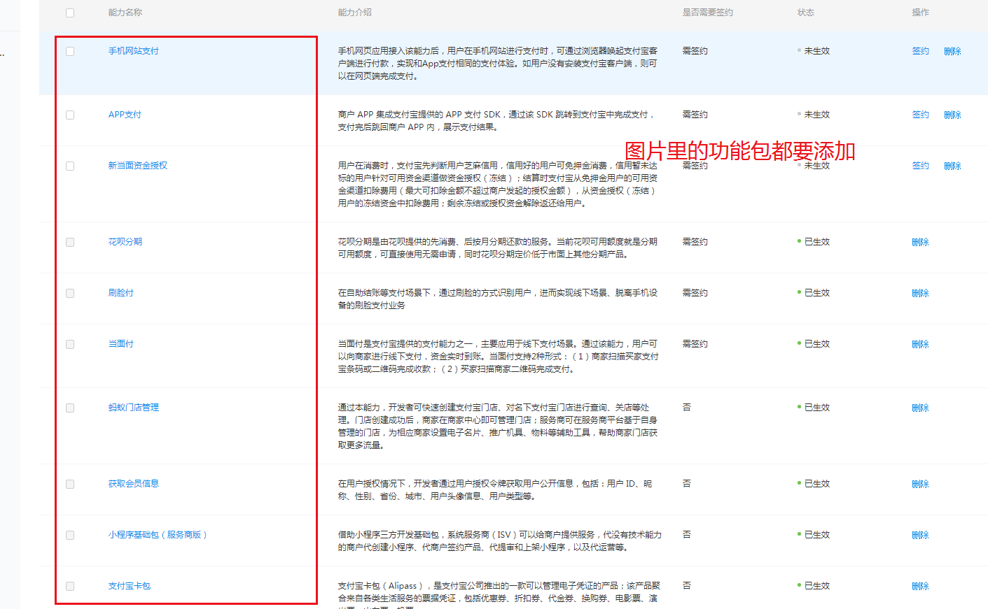 #### 必须添加的为:获取会员信息、蚂蚁门店管理、服务商代运营基础包、服务市场基础包