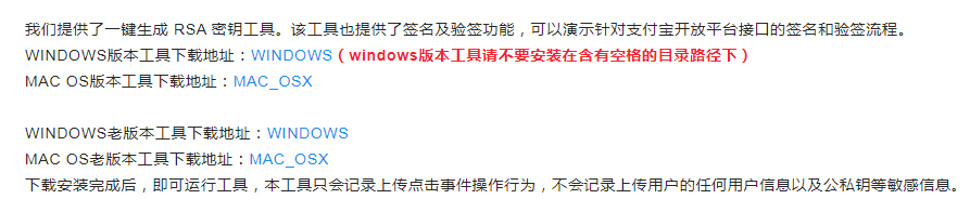 * \[5\]打开下载公钥工具的网址:[https://docs.open.alipay.com/291/106097/](https://docs.open.alipay.com/291/106097/)进入下载工具页面,选择您电脑的操作系统,选择对应的“WINDOWS”or“MAC\_OSX”版本下载。保存下载好的文件---解压---打开文件夹----点击“RSA签名验签工具”运行该工具