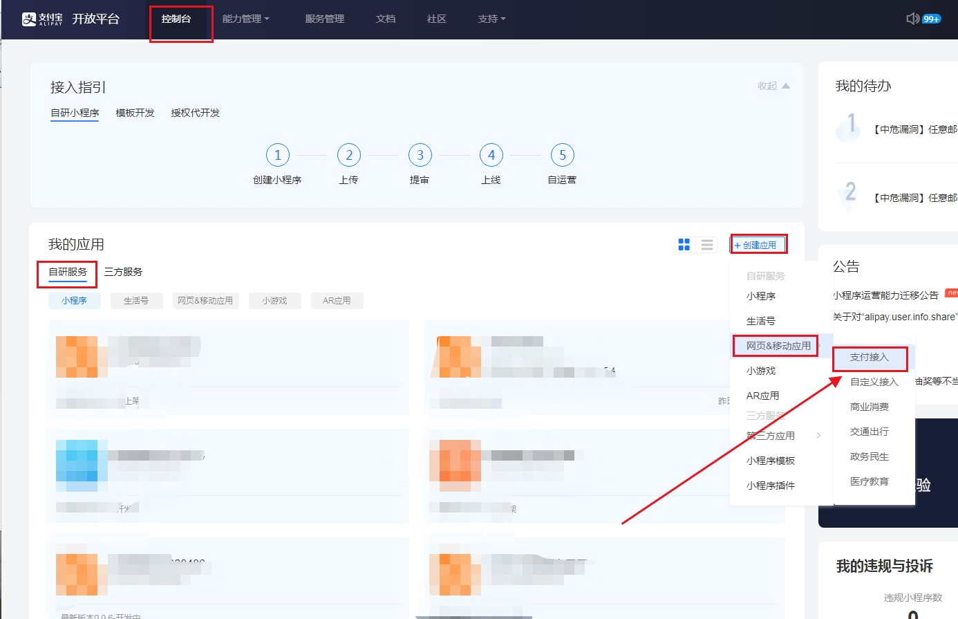 #### 1、自研服务 → 创建应用 → 网页移动应用 → 选择:支付接入