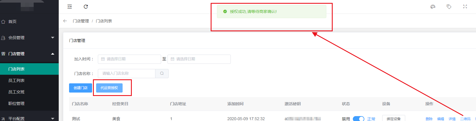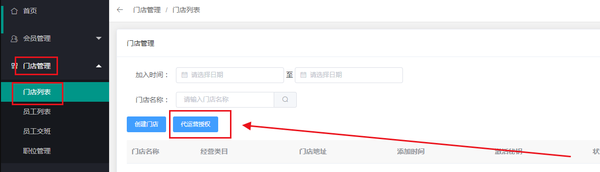 #### 1、商家后台,点击门店管理 → 门店列表 → 点击:代运营授权