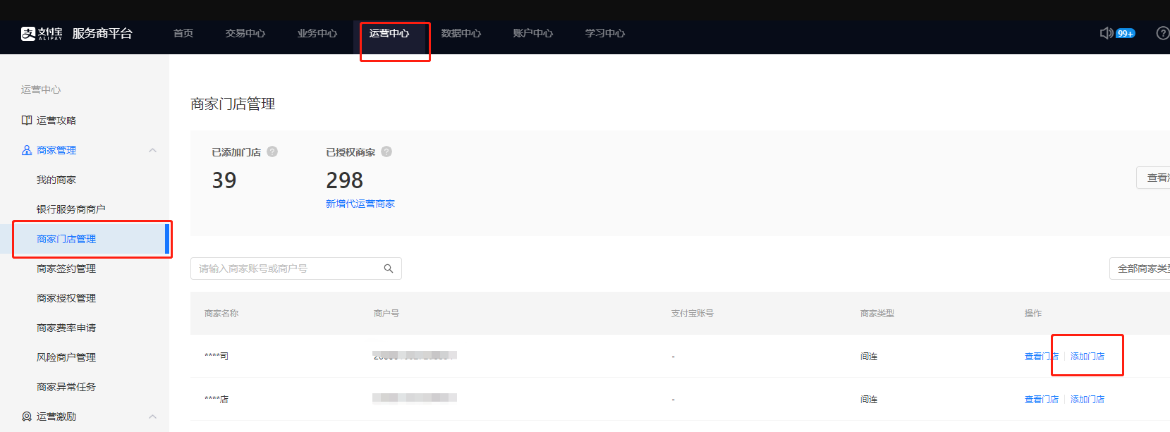#### 1、到支付宝服务商后台找到对应商户,然后点击添加门店