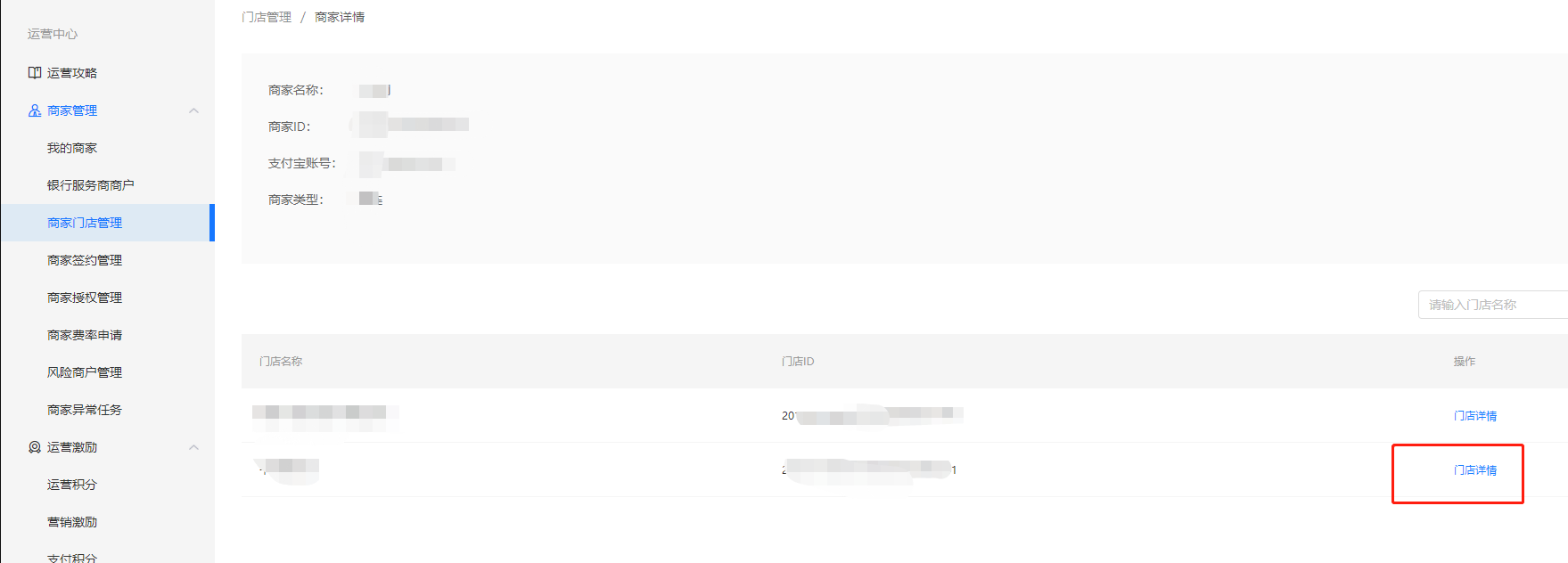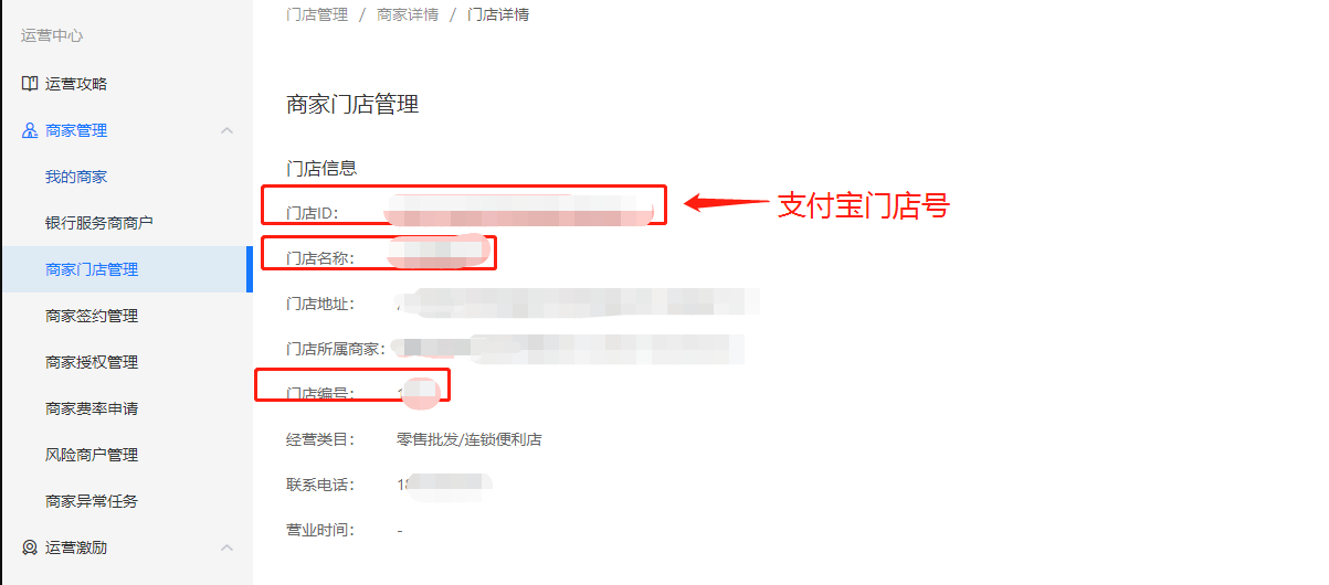 #### 3、到对应商户后台,找到该门店,点击已有支付宝门店并填写参数