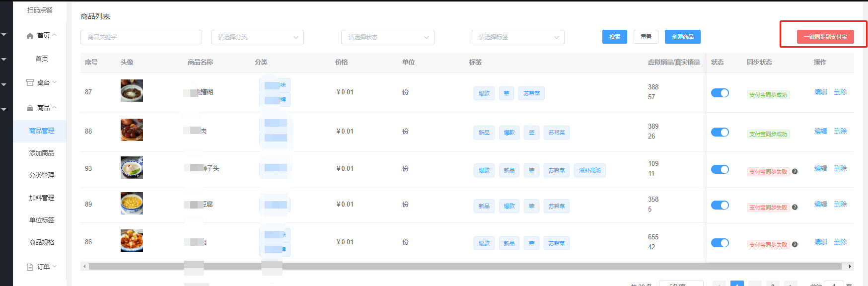 8、商品添加完成之后,点击同步至一键同步至支付宝(注意:此步骤很重要)