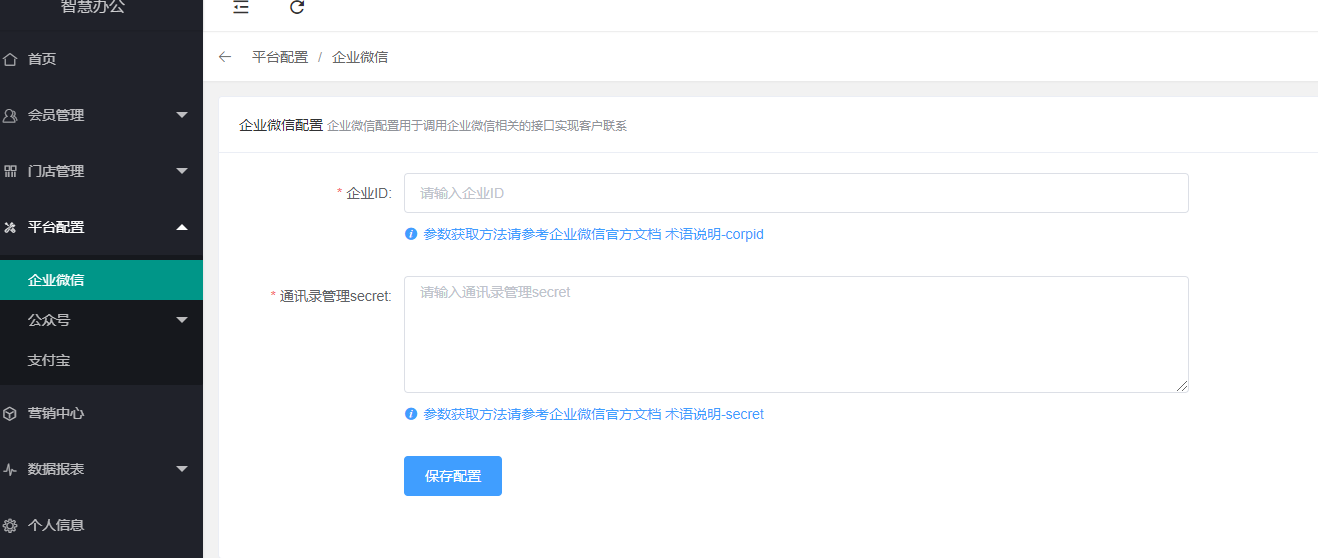 登录系统商家后台,正确填写企业微信配置并保存。页面操作路径:【平台配置---企业微信】