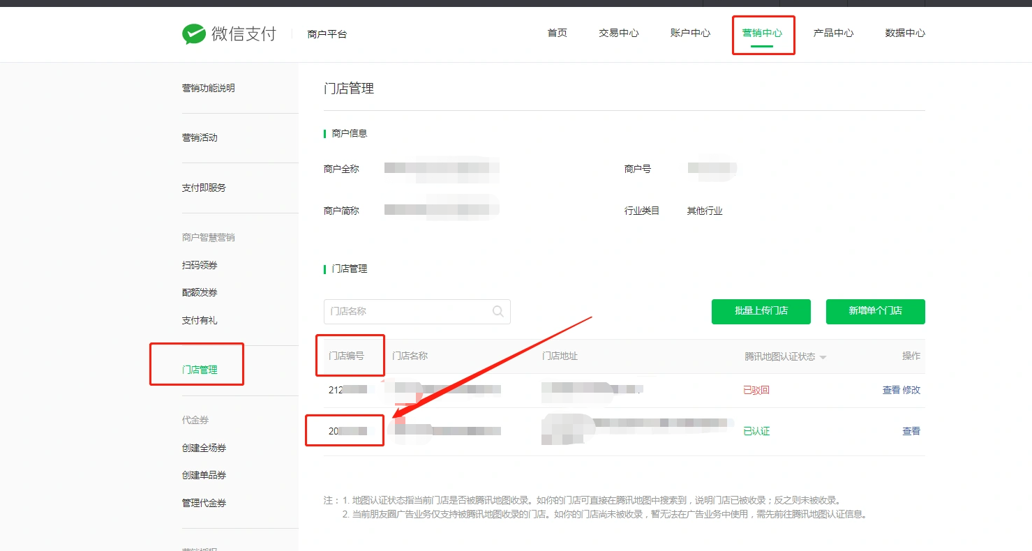 登陆商家的商户号,点击营销中心---门店管理,获取门店ID