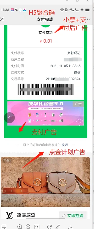 (2)通过点金计划设置的微信小票样式,在小票样式里面嵌入了后台设置的支付后广告呈现,具体小票设置方法:# 点金计划支付后商家小票广告配置