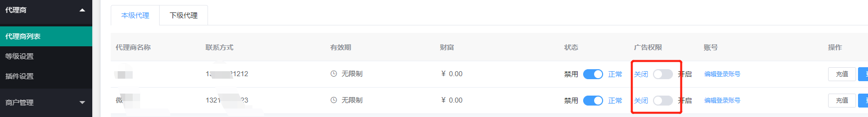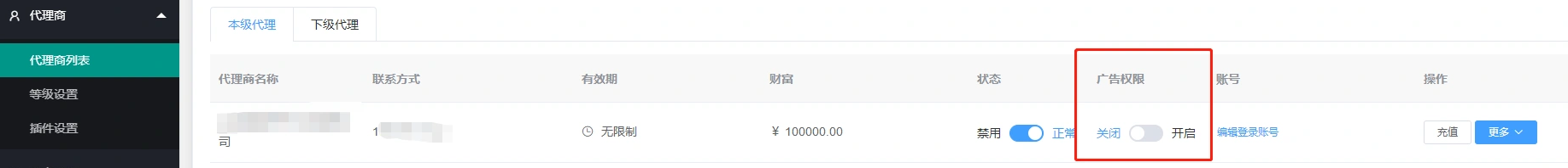 然后检查是否给代理商广告权限,广告权限在谁的手中,是合伙人还是代理商。合伙人和代理商广告二选一**
