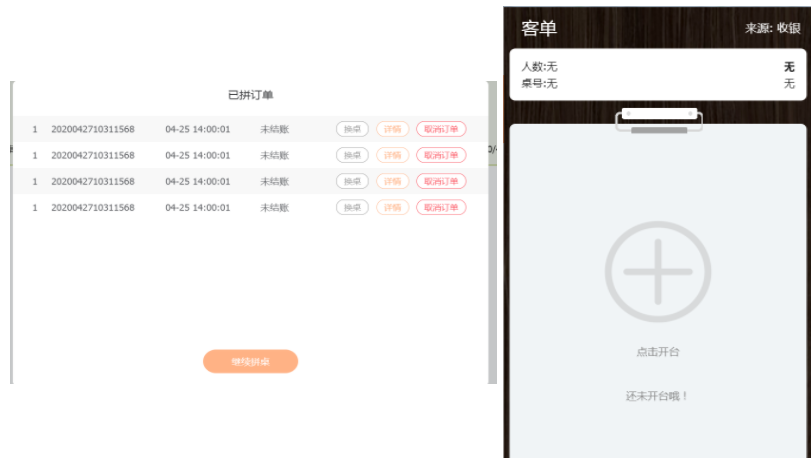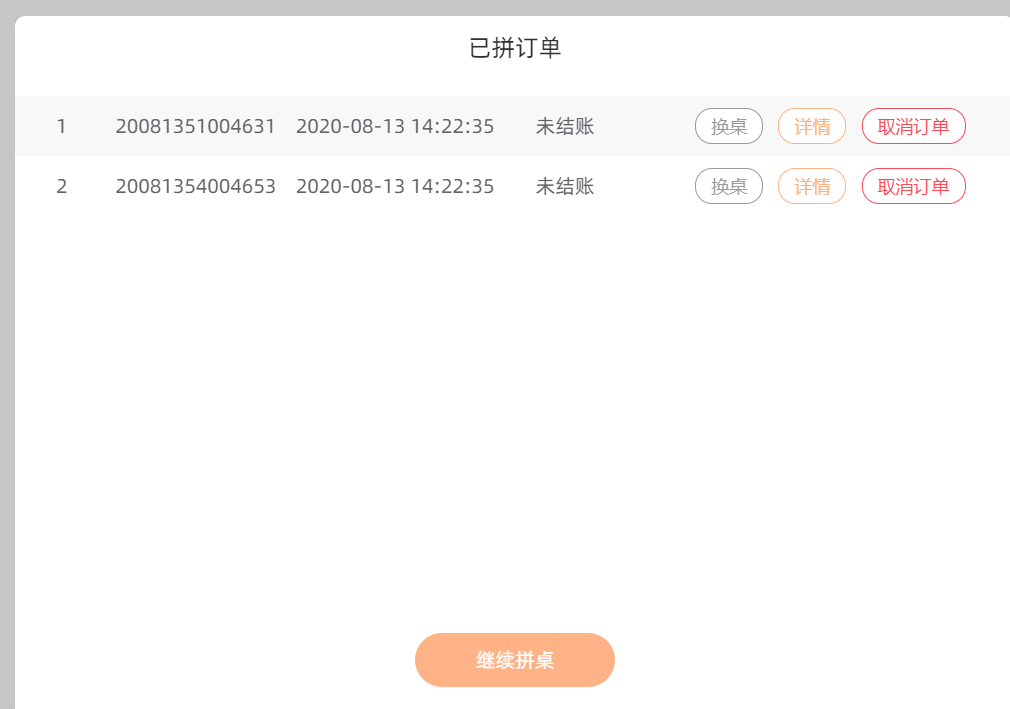 下面是一桌多单,拼桌的展示。用户可在有空桌时点击换桌,将此单换到另一桌台,那当前桌台就不会在拼桌中显示了,同时点击取消订单,这个单就会消失,这个桌台也就不是拼桌的了。会回到已出单中。