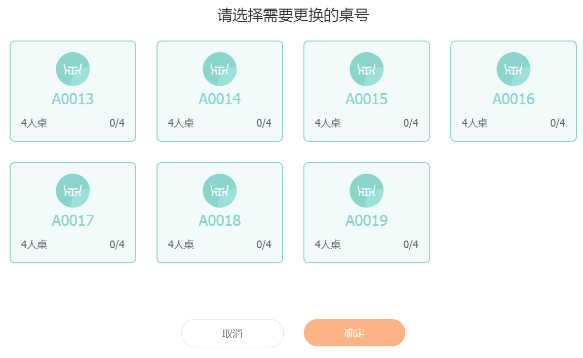 当客户提要求需要换桌时,用户可点击换桌,跳转到请选择需要更换的桌号的页面,单选某个桌台。