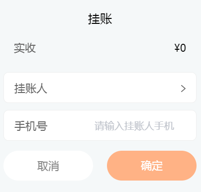 用户在客户需要挂账时可点击【挂账】,填写挂账人信息。会在挂账订单中看到。
