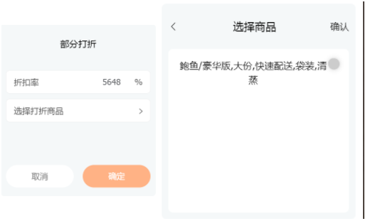 当为部分打折时,用户需要点击【选择打折商品】,进入选择商品页面,选择好后点击【确认】,返回付款页面后输入折扣率。此处可多选菜品,同时进行打折(如果需要给菜品进行不同折扣的打折,需要多次单个选择,操作;另外当给菜品部分打折后就不能给这个菜品修改部分打折,只能点击清空折扣后再次打折)。