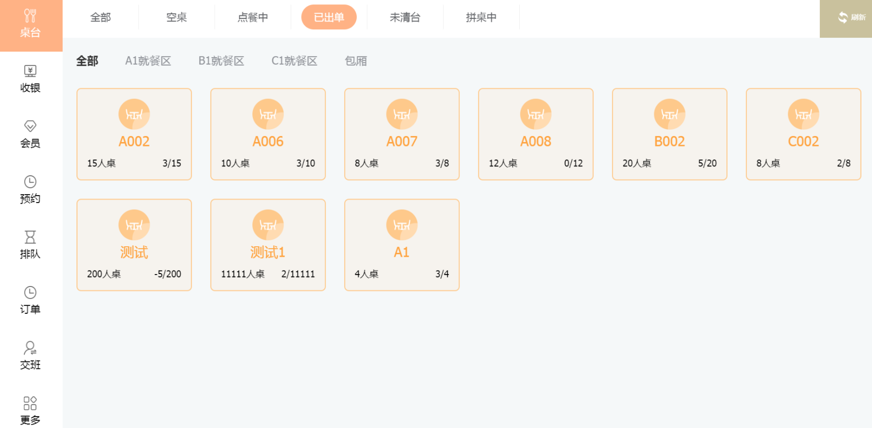 已出单下方为桌台的区域,区域由商家自己设定,建议每个区域下对应的桌台人数都是相同的。