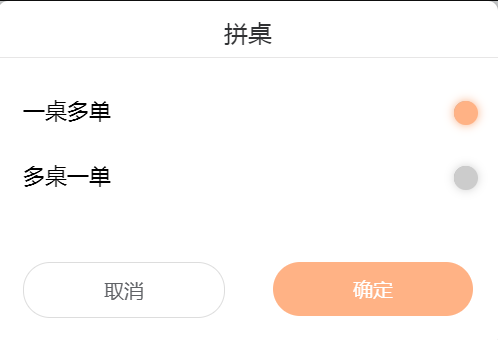 用户可在客户的要求下点击拼桌,选择一桌多单(一个桌子上由多个单组成)或多桌一单(多个桌子有合并成一个单子)。