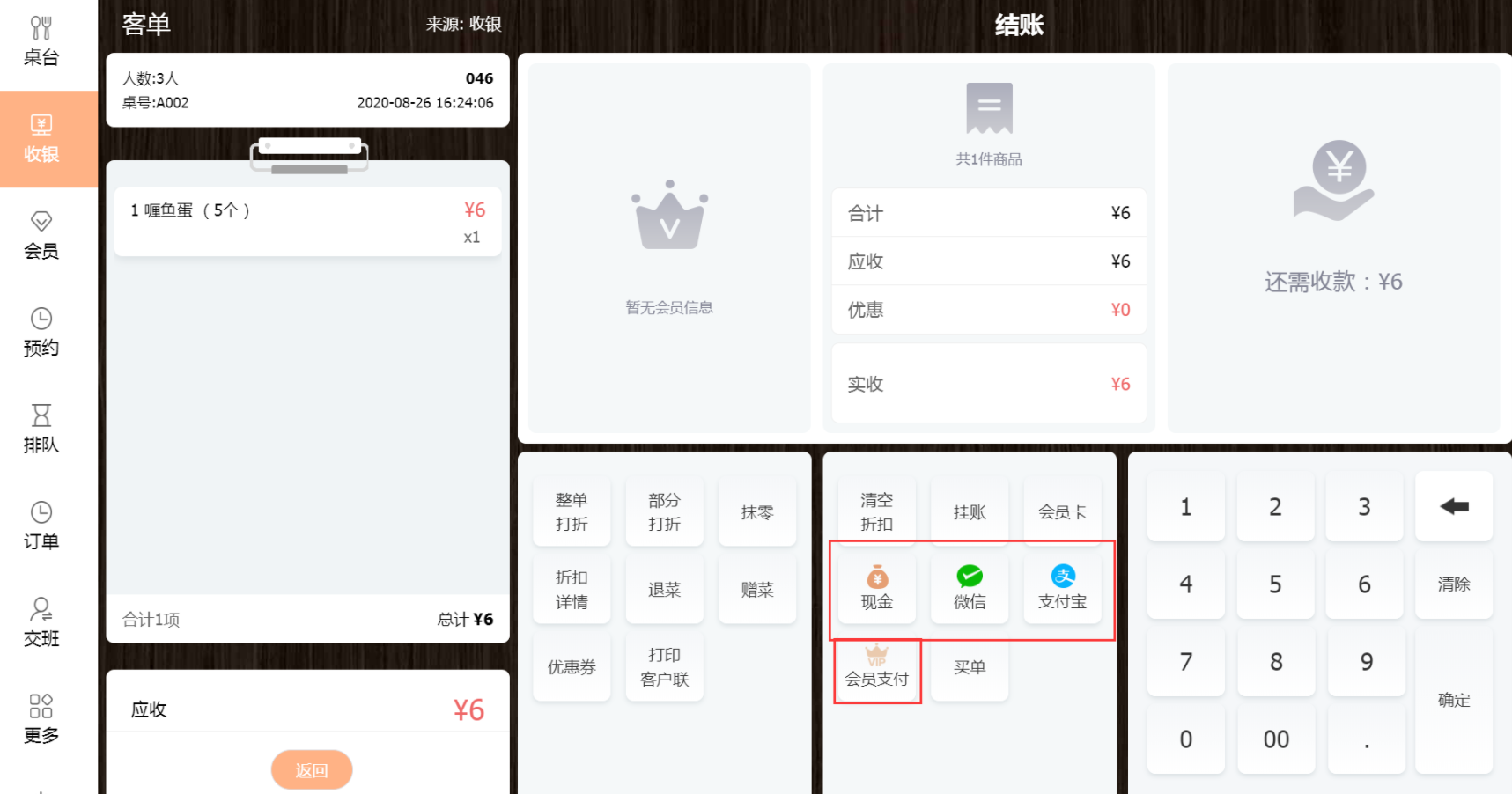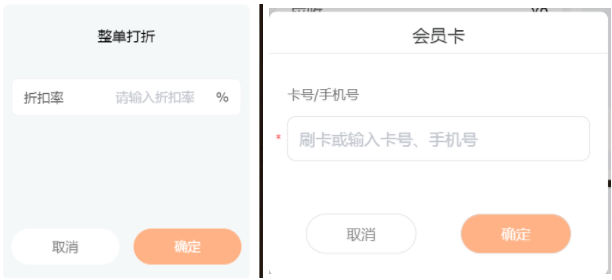 当为整单打折时,用户只需要输入折扣率,选择支付方式即可。(如果客户有会员卡,可点击会员卡,添加会员进行会员打折,在结账页面添加会员卡只能享有会员折扣,不享受会员价,在下单前在收银页面添加会员卡,才会同时享有会员价和会员折扣)