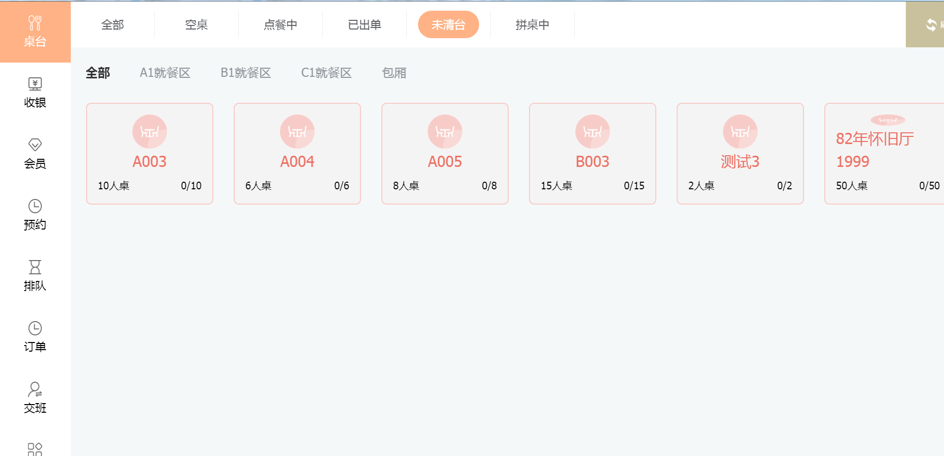 用户可点击【未清台】,查看已经结账完成但是还没有收拾的桌台。
