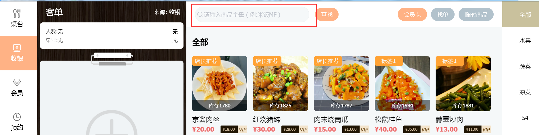 用户可输入商品字母,点击【查找】搜索菜品。