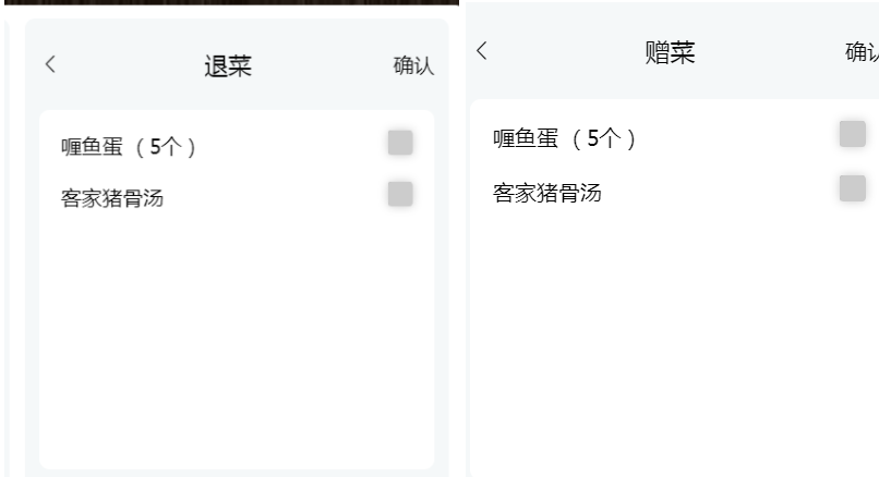 用户可点击退菜赠菜按钮,选择菜品进行退菜或赠菜,另外不能所有的菜品都退或赠,最少留一个。否则会报提示,并且操作不能成功