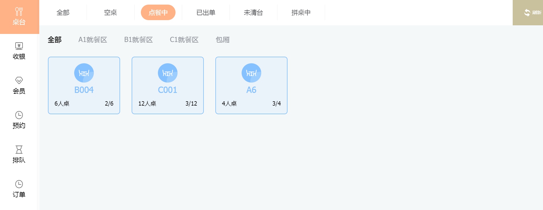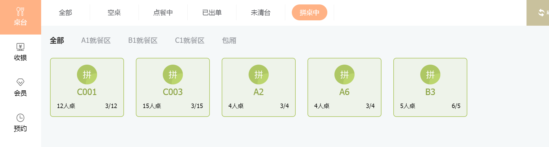 (当机器卡住时,右上角可点击【刷新】,重新加载)拼桌中下方指的是桌台区域。