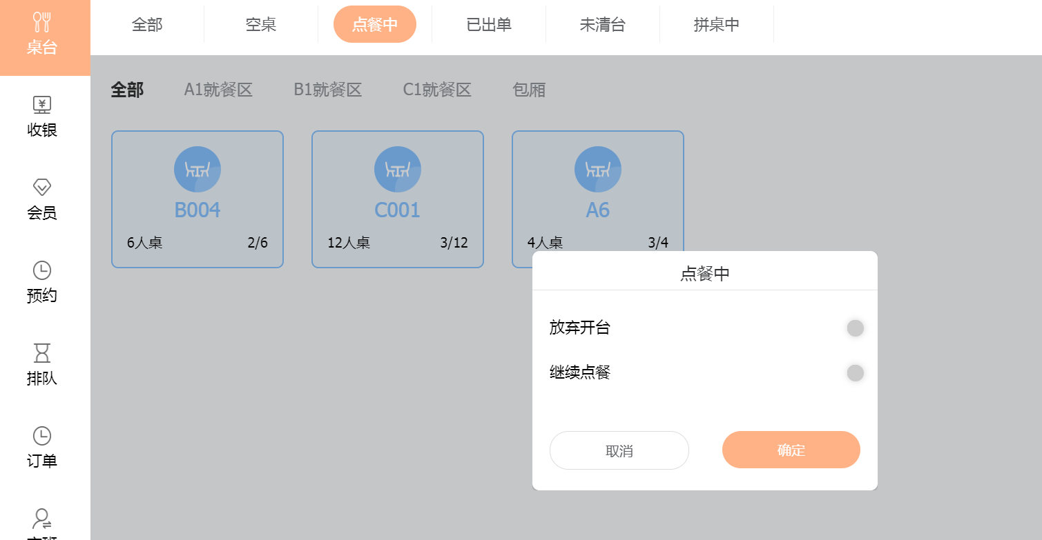 (如果客人没有点菜后直接走了,但是已经开台了,我们可以点击点餐中下面的这个桌台,会出现下面的弹框,确认放弃开台,然后此桌台就会跳转到未清台中,也可点击继续点餐,进入收银页面)