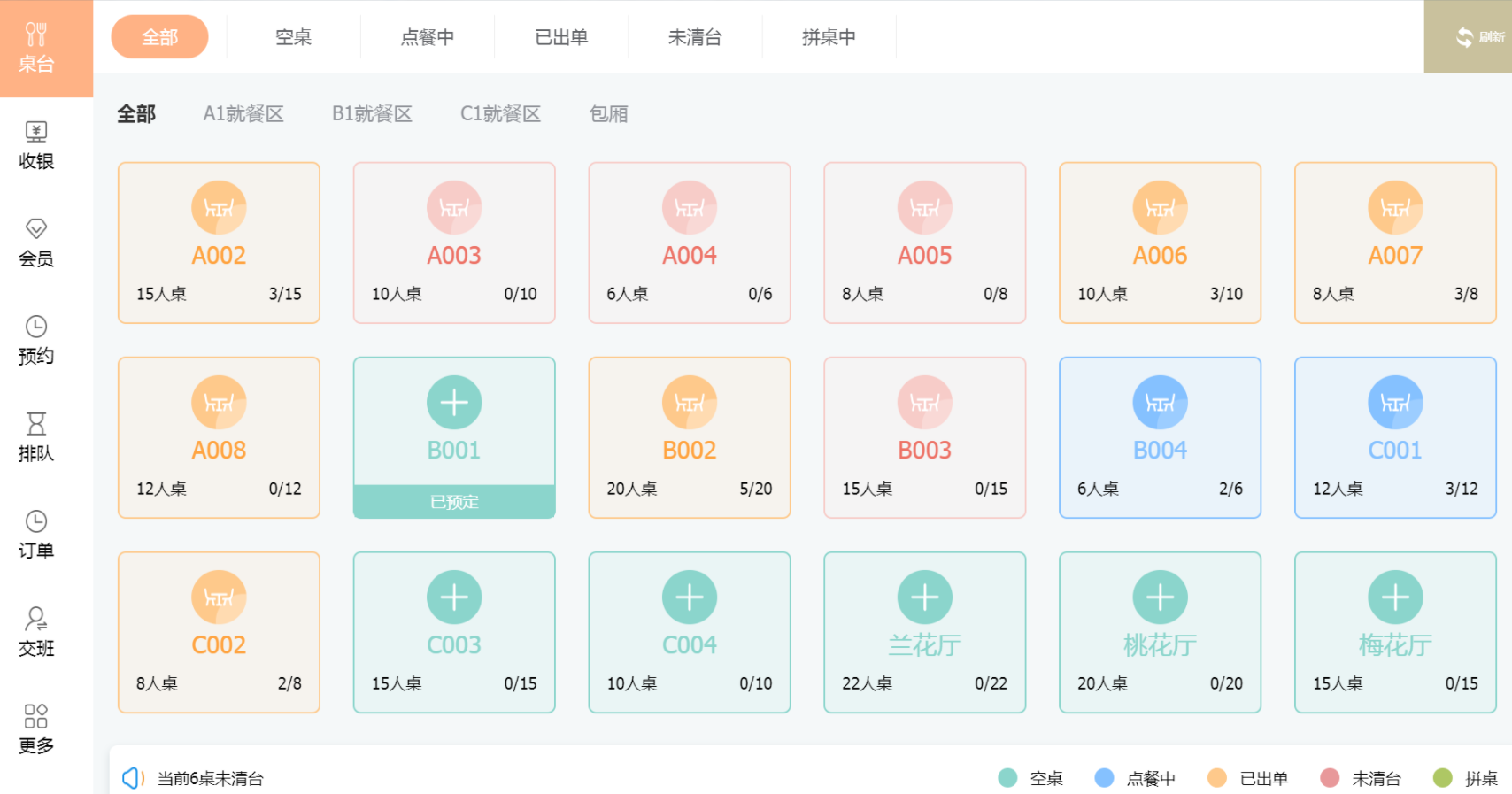 全部下底部会显示当前有多少桌未清台。(当机器卡住时,右上角可点击【刷新】,重新加载)