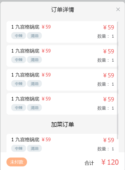 用户可根据客户要求点击【换桌】将客户换到别的桌台。也可以点击【详情】在下图中查看客户的订单详情。