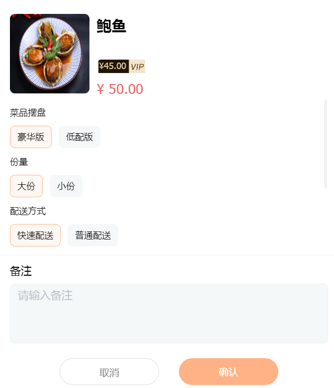 用户可依据客户的要求选择商品属性和商品规格(温馨提示,属性值是会有默认值的,所以为了客户有个美好的用餐时光,建议一定要询问后才选择)。