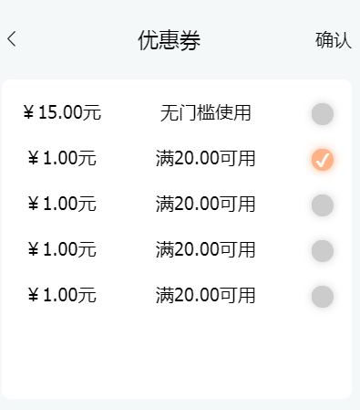 用户在登录会员后,如果此会员下有优惠券,可点击优惠券选择客户想使用的优惠券,点击确定即可使用。(优惠券只能在小程序端领取)