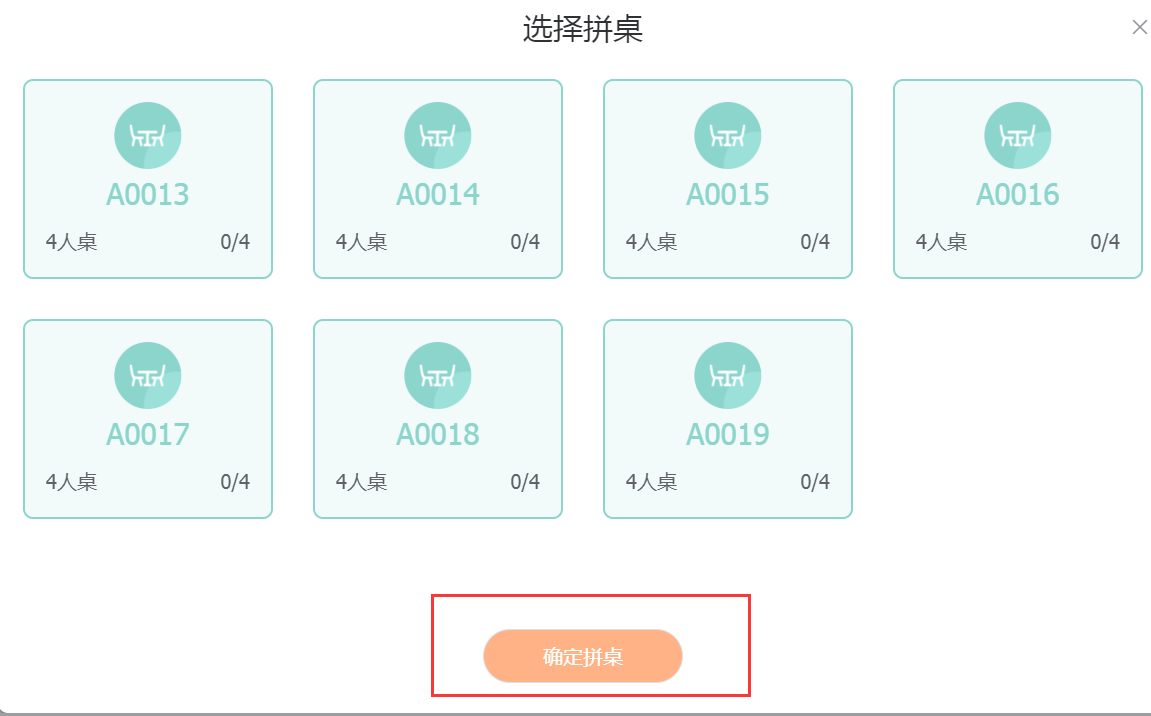 当需要拼桌时我们可以点击下方的拼桌按钮,跳转到选择拼桌页面,点击你想拼桌的桌台,点击【确认拼桌】即可。(可多选