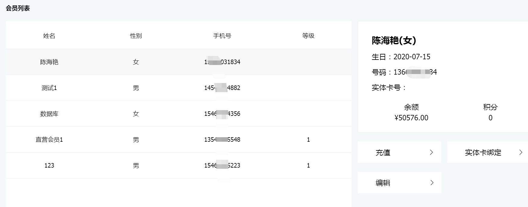 用户可点击会员列表中的会员,就会在左侧显示会员的详细信息。