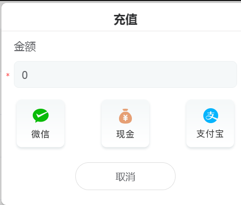 用户在客户需要充值时可点击【充值】,进入充值页面,选择客户需要的充值方式。(温馨提示:微信和支付宝需要扫码枪进行扫码)