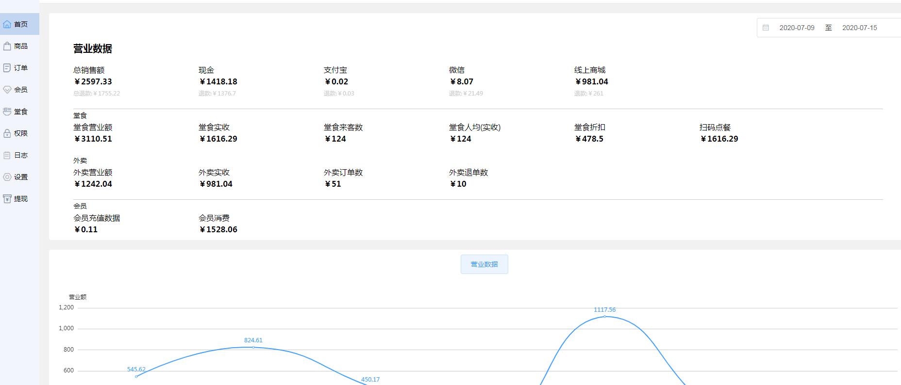 用户可通过营业数据展示和线状图两种方式,了解营业数据和营业状况。